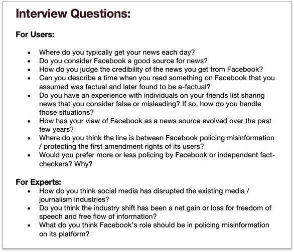 We chose to conduct user interviews to gain a first-hand understanding of how or if people use Facebook to consume news items.